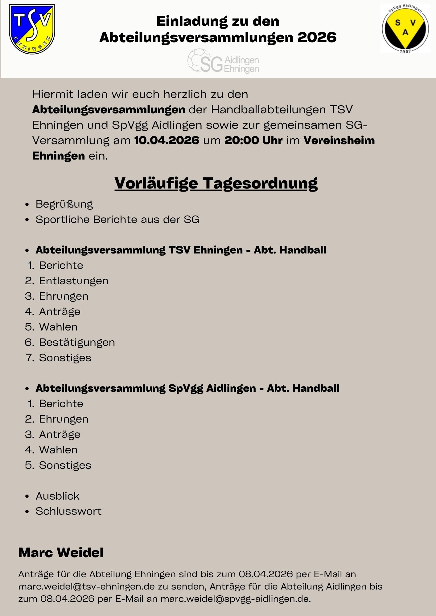 Am 10. April findet um 20 Uhr die Jahreshauptversammlung der Abteilung Handball statt. Wir treffen uns im Vereinsheim des TSV Ehningen. Die Handball-JHVs des TSV und der SpVgg werden dieses Jahr an einem gemeinsamen Termin stattfinden. Ganz im Sinne unserer SGAE!